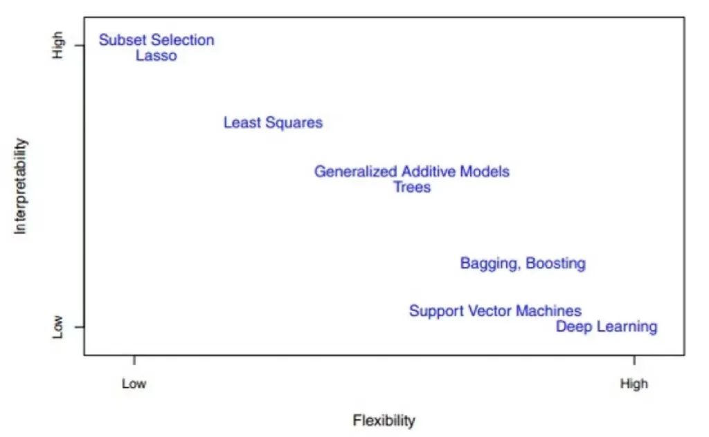 说到这不禁会有疑问,这样说来 flexibility 更好的方法不是我们的最佳选择吗?为什么还需要那些 flexibility 较差的方法呢?实际上,这里有一个很重要的 trade-off,那就是模型的预测精度与模型的可解释性。通常来说,以线性模型为代表的 flexibity 较差的模型,虽然它们能够构建的模型范围有限,导致其可能捕捉不到一些数据里的信息、造成预测精度较低,但是它们通常有着较为清晰的模型形式,比如线性模型可以将输出 Y 表示为输入 X 的线性组合,我们就可以清晰的分析出哪些变量会影响输出,这样的模型可解释性就非常高。