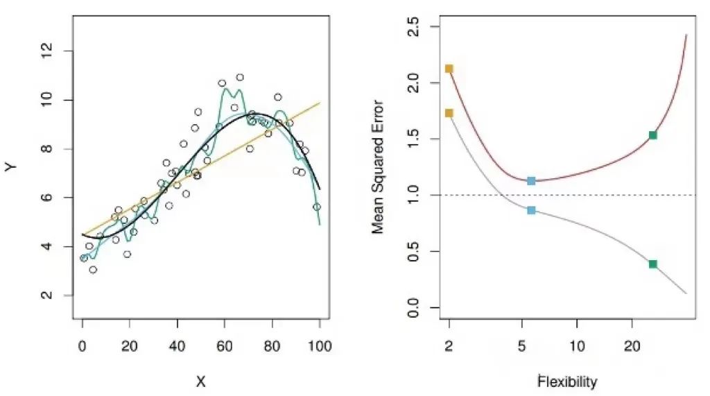 此外,在右图中,我们发现红色所代表的 test MSE 出现了一个典型的先降后升的“U型”趋势图,然而灰色所代表的 train MSE 则是一路下降。换句话说,随着模型 flexibility 的提升,train MSE 不断下降,这很容易理解,因为模型 flexibility 不断提升的过程中在不断的贴近训练集中的数据。而作为我们衡量模型好坏的标准,test MSE 先降后升,说明模型 flexibility 不是越高越好。模型 flexibility 不断提升的过程中,到底发生了什么?