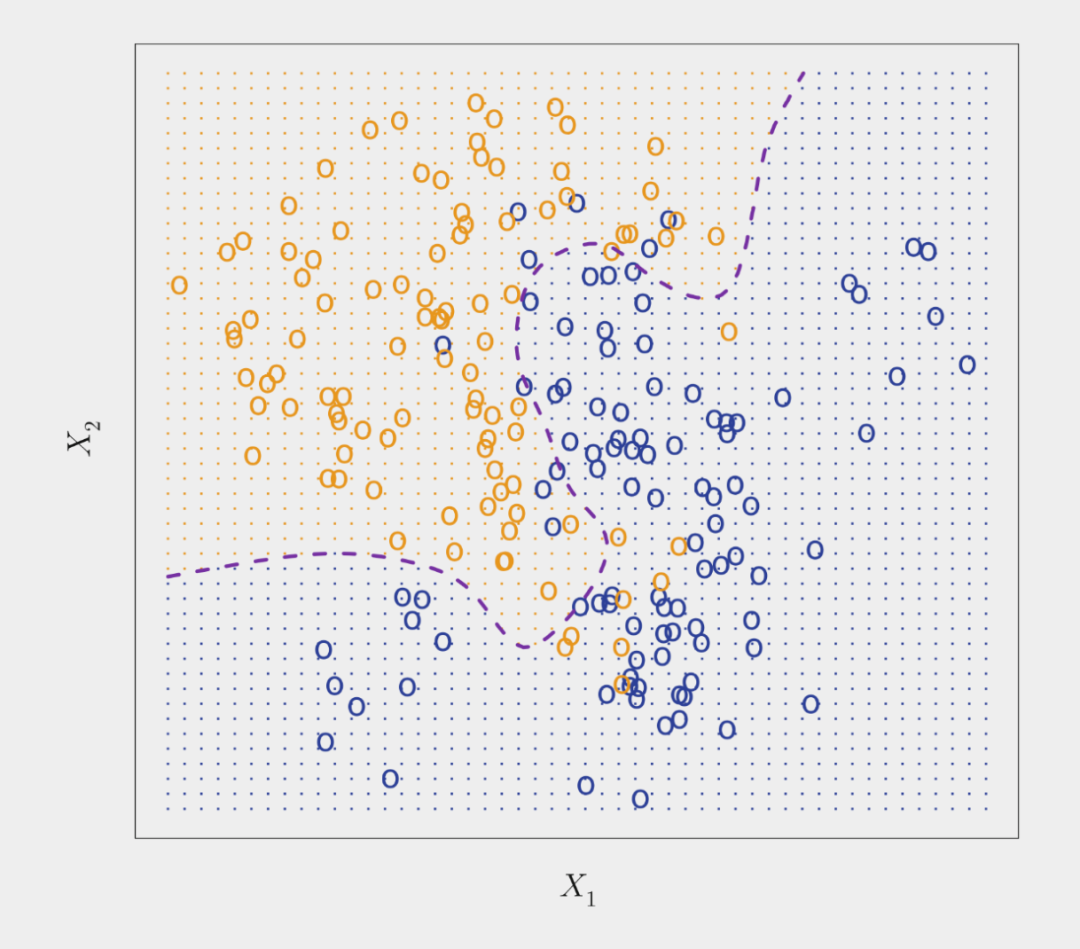 考虑到贝叶斯分类器的特点,理论上我们总是想用它来做分类任务。但是在真实数据集中,对于给定的样本 x,其所属类 Y 的条件分布是不可知的。所以贝叶斯分类器对我们而言是一个无法达到的标准,很多分类器也是通过根据训练数据估计以上条件分布来对样本进行分类的。一个很简单的例子就是 K 近邻法(KNN),在 KNN 中,可以通过调整 K 值来调整模型的 flexibility,K 值较大时模型 flexibility 较小,而 K 值较小时模型 flexibility 较大。选择合适的K值可以达到接近(略低于)贝叶斯分类器的分类效果。