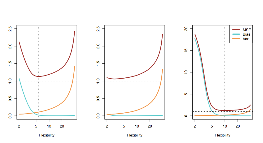 下图是在三个不同的模拟数据集上所拟合模型的结果,很容易看出,不管真实模型如何,variance-bias trade-off 都存在。有一点需要说明的是,红线指的是 test MSE,黑色虚线指的则是随机误差的方差,可以看出针对给定数据集,任何统计学习方法/模型所能达到的理论最小 test MSE 就是随机误差的方差。