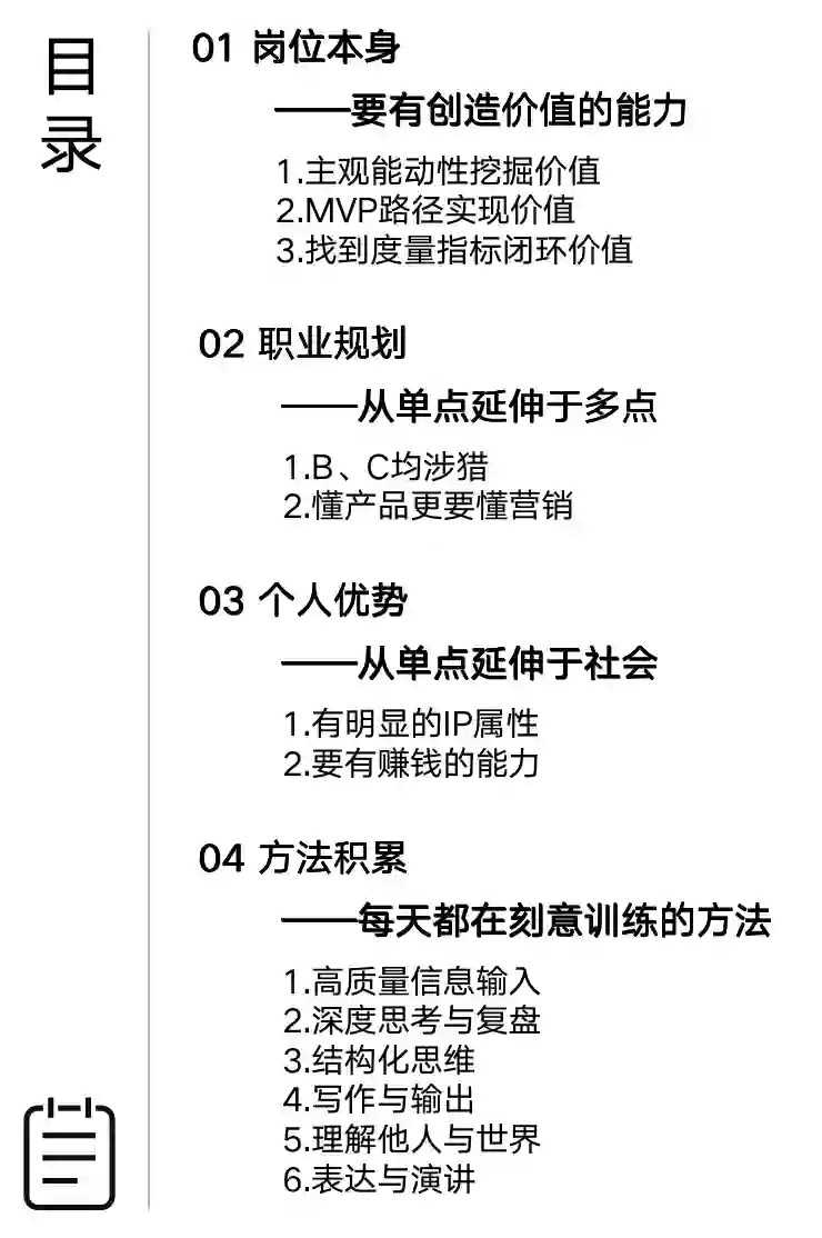 在去年总结文章里,开篇第1部分讲到产品岗位认知升华,认为产品经理是一个创造价值的岗位,可以理解为从业务负责人的视角,去考虑做每件事的产出价值是什么。