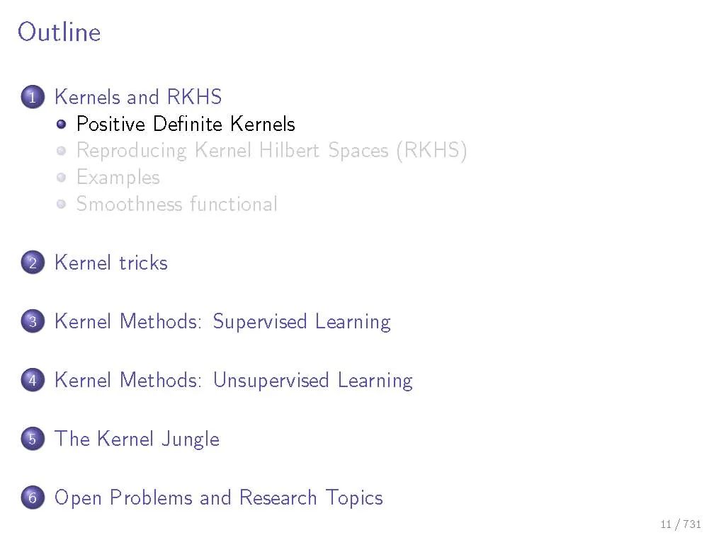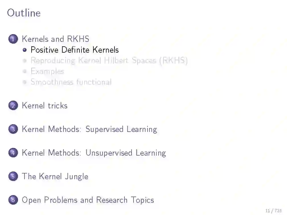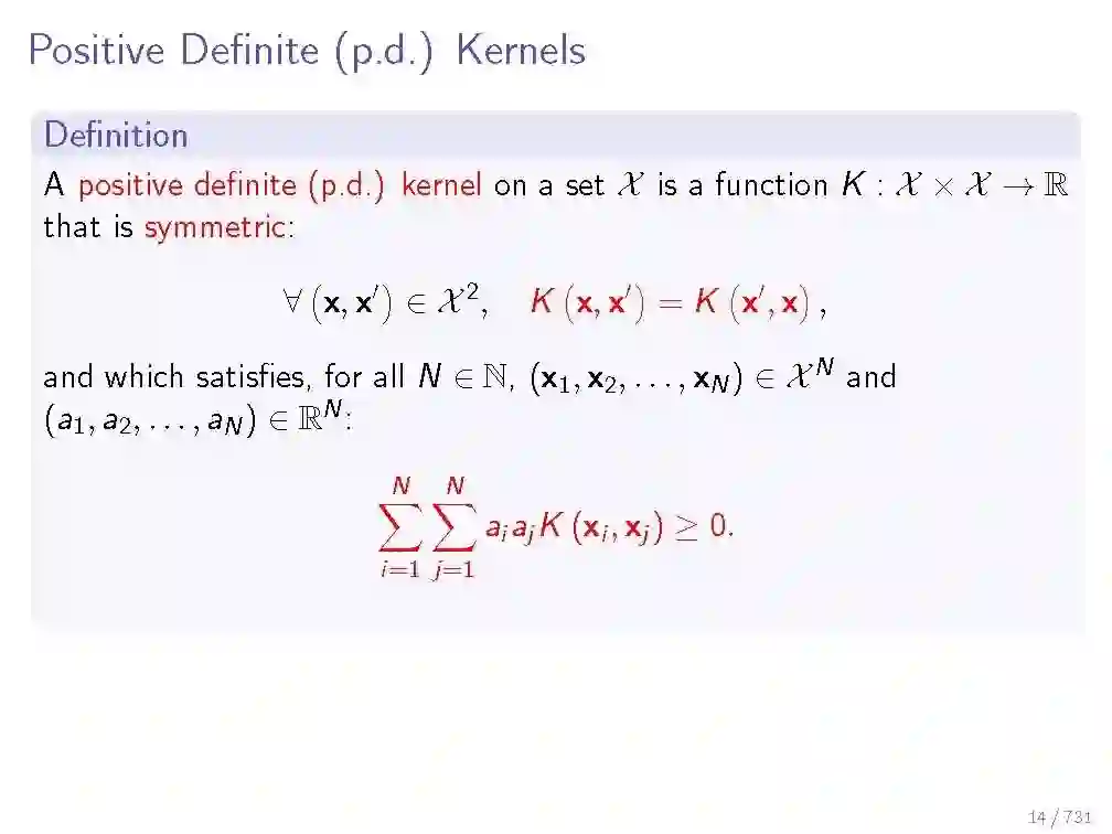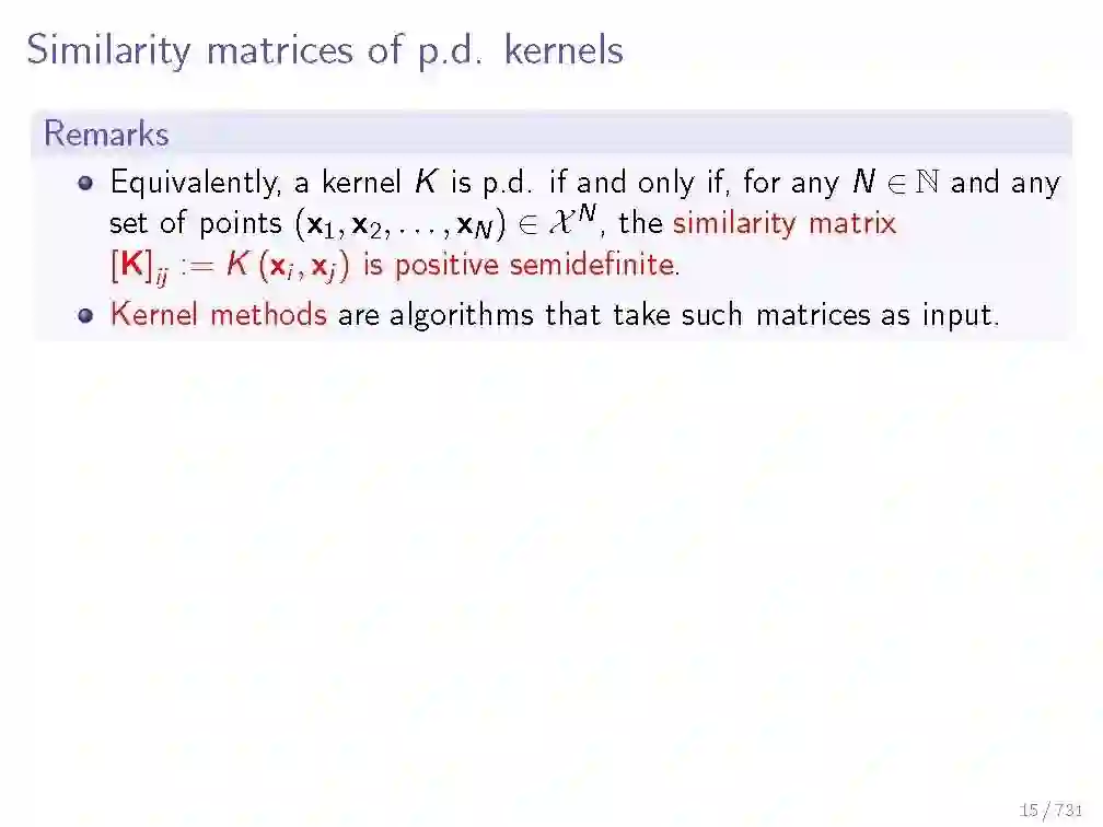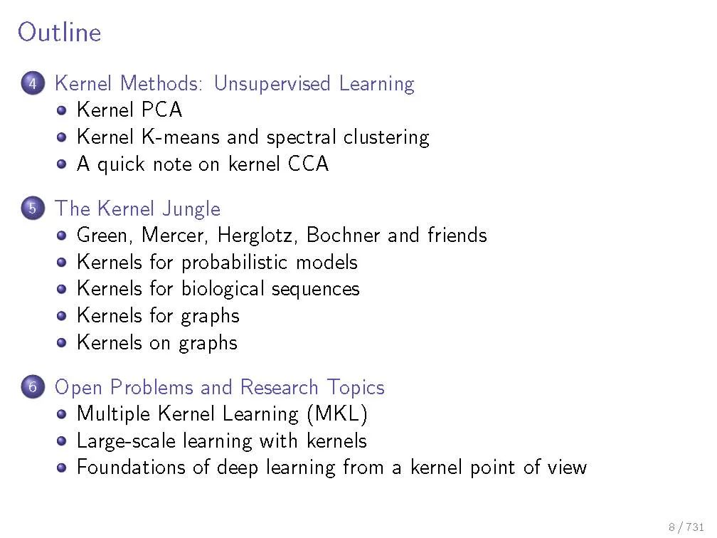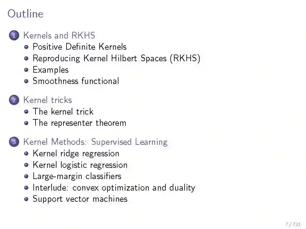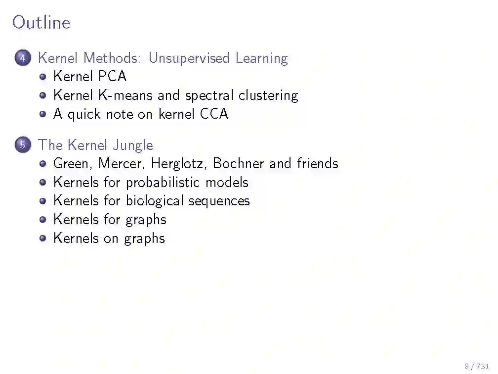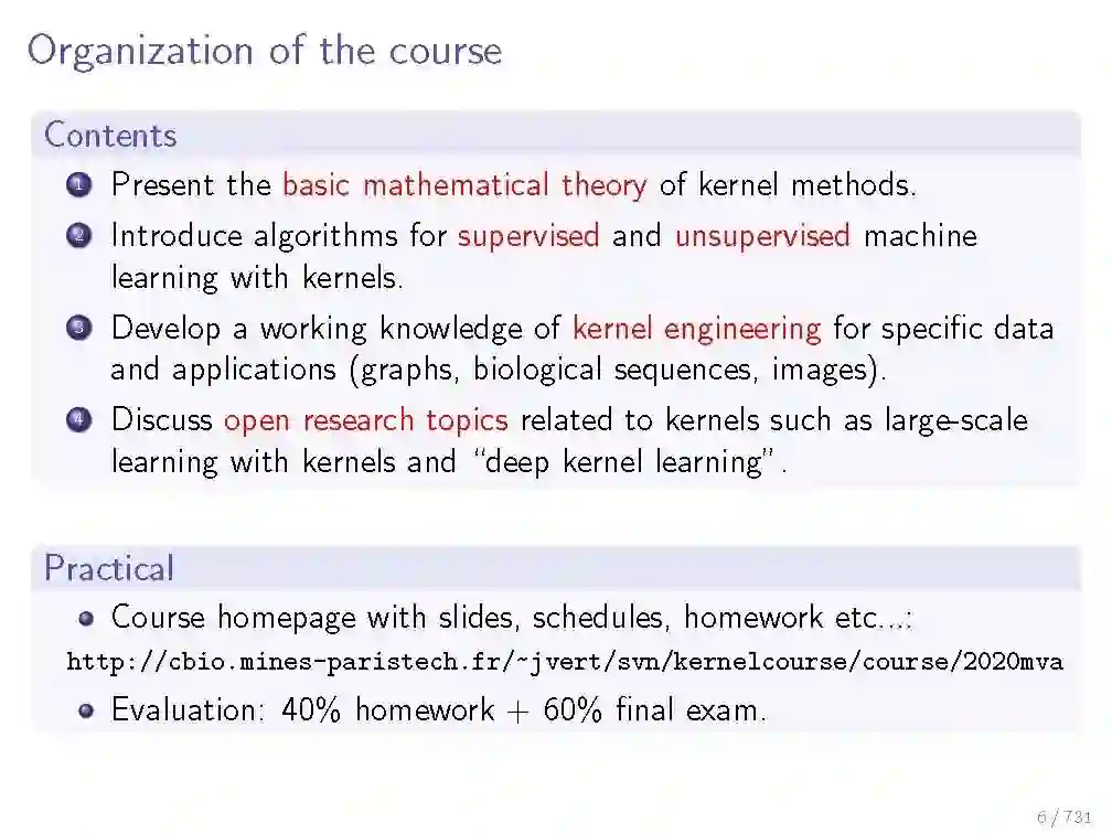 本课程的目的是介绍核方法的数学基础,以及到目前为止在核设计中出现的主要方法。我们将首先介绍正定核的理论和重建核希尔伯特空间,这将允许我们介绍几种核方法,包括核主成分分析和支持向量机。然后我们再回到定义内核的问题。我们将介绍关于Mercer核和半群核的主要结果,以及字符串和图的核的一些例子,从计算生物学的应用,文本处理和图像分析。最后,我们将讨论一些活跃的研究课题,如大规模核方法和深度核机器。