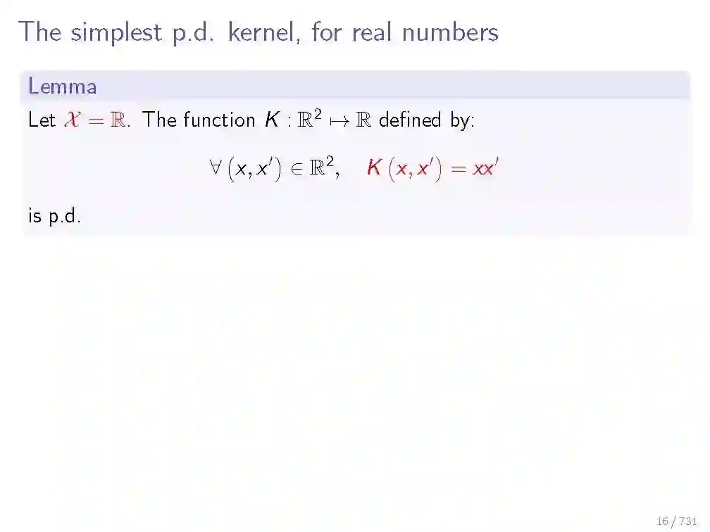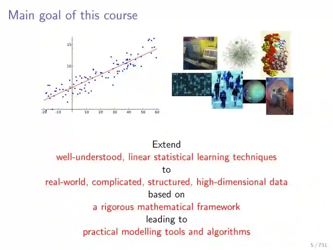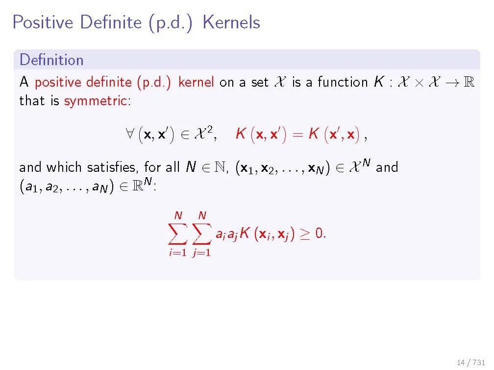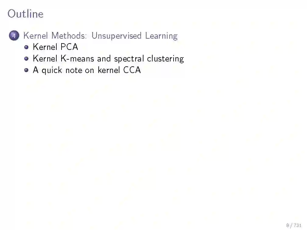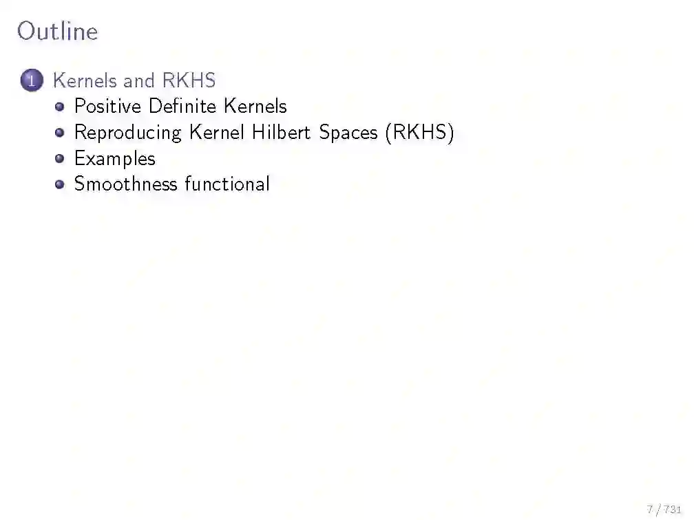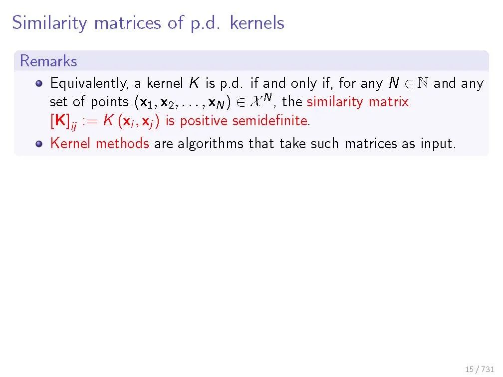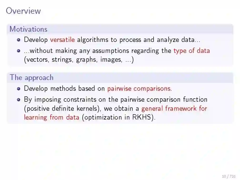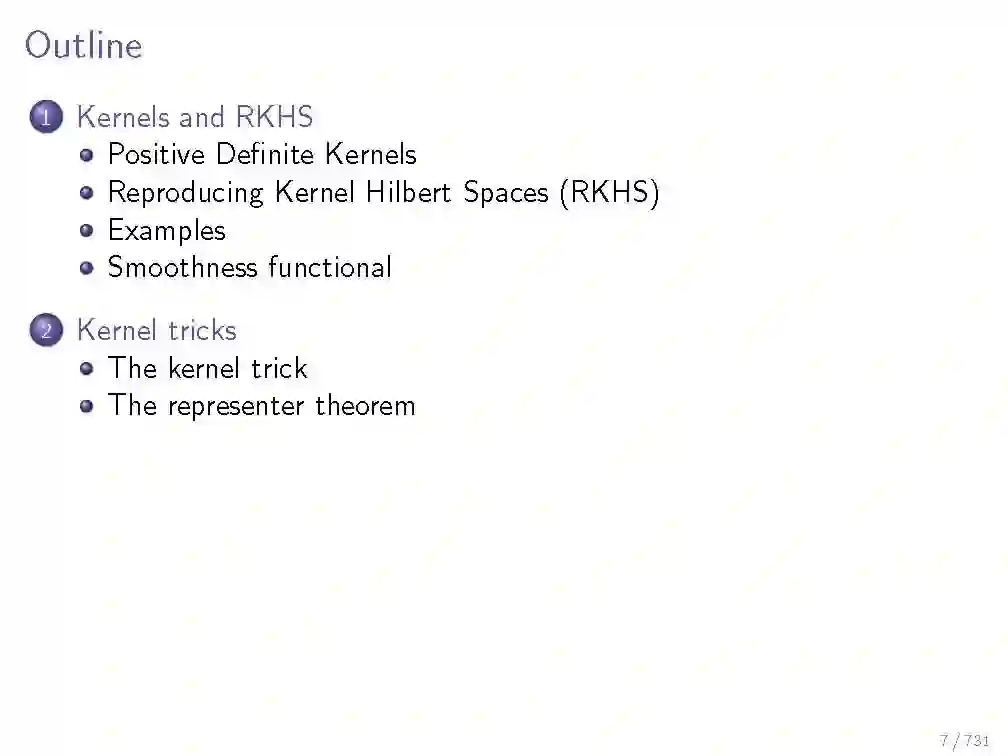 本课程的目的是介绍核方法的数学基础,以及到目前为止在核设计中出现的主要方法。我们将首先介绍正定核的理论和重建核希尔伯特空间,这将允许我们介绍几种核方法,包括核主成分分析和支持向量机。然后我们再回到定义内核的问题。我们将介绍关于Mercer核和半群核的主要结果,以及字符串和图的核的一些例子,从计算生物学的应用,文本处理和图像分析。最后,我们将讨论一些活跃的研究课题,如大规模核方法和深度核机器。