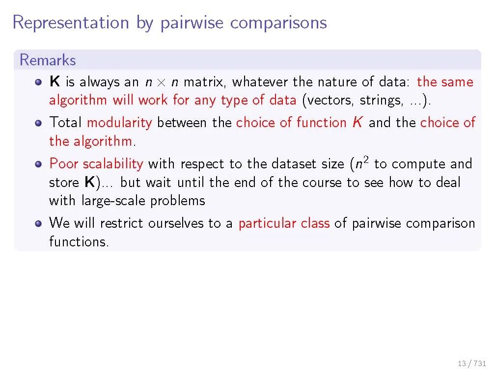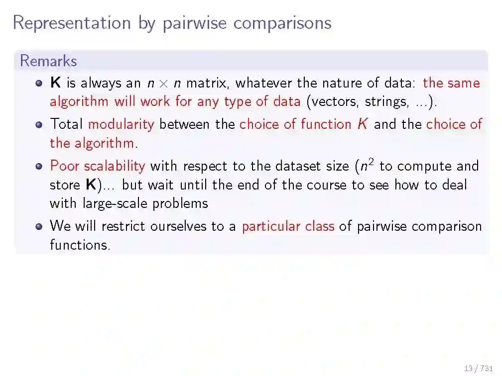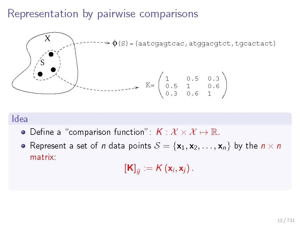内核方法是一类非常适合于此类问题的算法。实际上,它们将最初为向量设计的许多统计方法的适用性扩展到了几乎任何类型的数据,而不需要对数据进行明确的向量化。向非向量扩展的代价是需要在对象之间定义一个所谓的正定核函数,形式上相当于数据的隐式向量化。近年来,各种对象内核设计的“艺术”取得了重要的进展,产生了许多最先进的算法,并在许多领域获得了成功的应用。