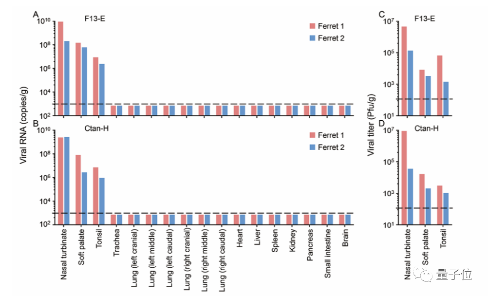 研究人员在这4只雪貂的鼻甲骨、软腭和扁桃体中均检测到了病毒RNA和具有传染力的病毒,但在其他器官中未检测到。