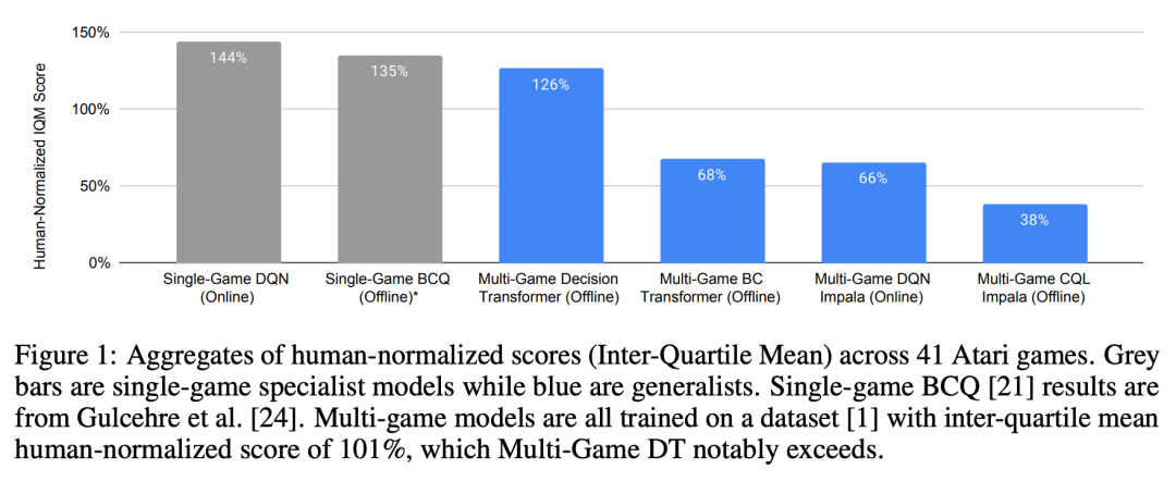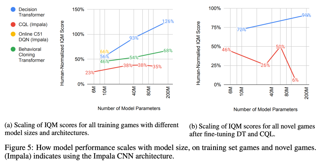 研究发现,在对离线专家数据集和非专家数据集进行训练之后,智能体可以在所有游戏中同时达到人类级别性能的 126%,如图 1 所示。此外,研究者还发现了与语言和视觉领域相似的趋势:用很少的数据快速适应从未见过的游戏(第 4.5 节) ,性能和模型大小之间的幂律关系(第 4.4 节) ,以及为更大的模型提供更快的训练进度。