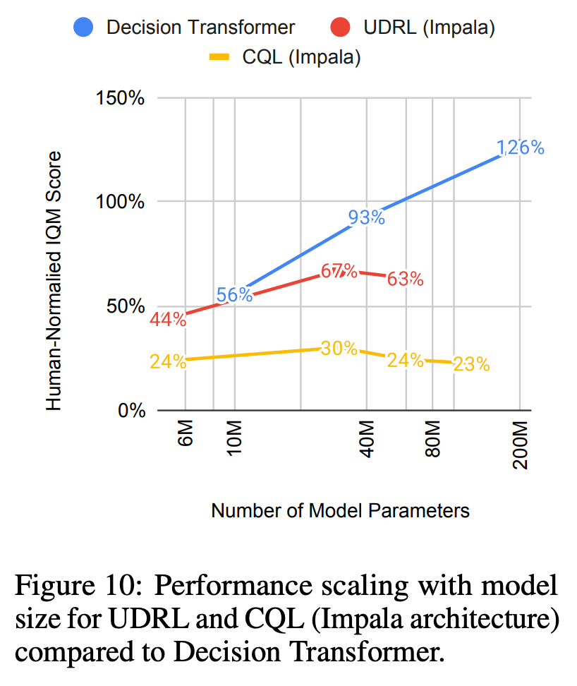 图 10 展示了使用 Impala 架构的决策 Transformer 相对于 UDRL 的明显优势。在比较 UDRL (Impla)和 CQL (在评估的每个模型尺寸上使用相同的 Impla)时,可以观察到 UDRL (impla)优于 CQL。结果表明,本文方法的好处不仅来自于使用的网络架构,同时来自于 UDRL 公式。