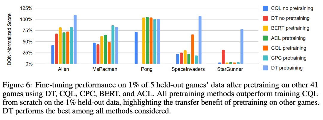 图 6 展示了对抗游戏中的微调性能。带有 DT 目标的预训练在所有游戏中表现最好,所有预训练的方法都比从零开始的训练有效,这证实了本研究的假设,即针对其他游戏的预训练确实有助于智能体快速学习一项新游戏。CPC 和 BERT 的表现不如 DT,这表明仅仅学习状态表征不足以达到理想的迁移效果。虽然 ACL 为 BERT 增加了一个动作预测辅助损失,但效果不明显,这表明在离线数据上正确建模动作对于获得良好的传输性能非常重要。此外,研究者还发现微调性能会随着 DT 模型变大而提高,而 CQL 微调性能与模型大小并不一致(参见图 5b)。
