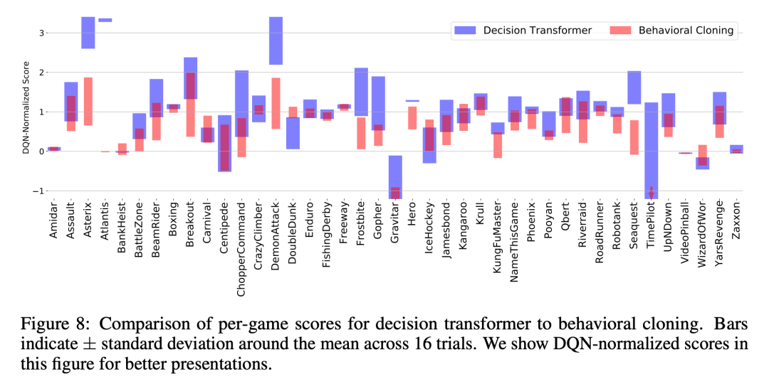 图 8 展示了所有游戏得分的平均值和标准差。虽然行为克隆有时可能会产生高回报的 episode,但这种情况此时不太可能发生。研究者发现,在 41 个游戏中,有 31 个游戏的决策 Transformer 的性能优于行为克隆。