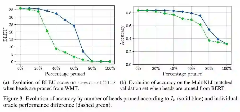 在一篇NIPS2019[3]中,作者等人主要研究了注意力头对结果的影响,评估的任务主要是encoder-decoder的NMT和BERT的MNLI。在预测阶段mask掉head进行研究后可以发现: