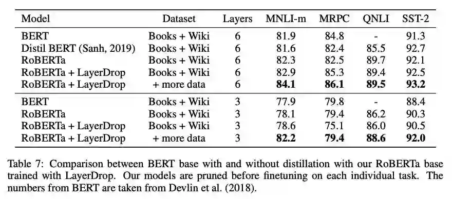 另外,只将LayerDrop应用在训练过程中还有提升效果的奇效,而且能提升一定的训练速度: