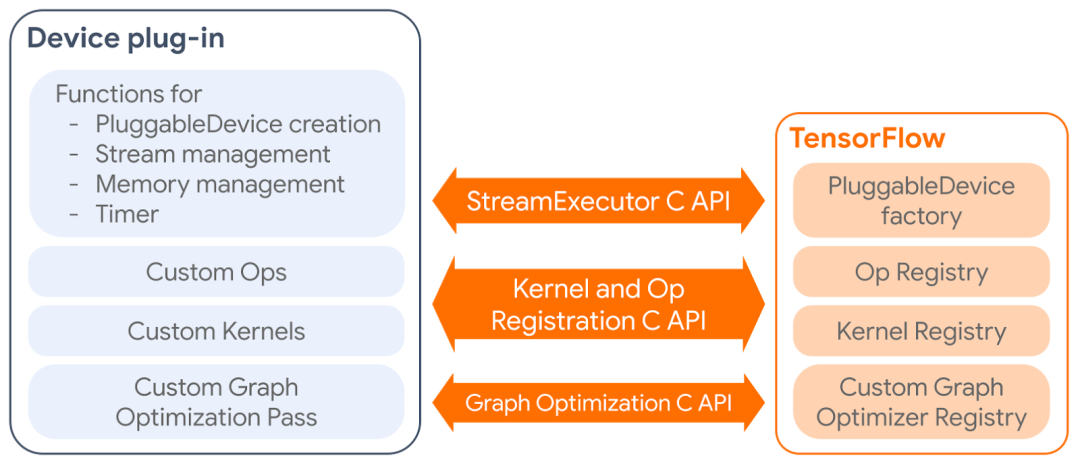 PluggableDevice 架构已在 TensorFlow 社区内完成了协同设计和开发。此架构利用了我们在 Modular TensorFlow 方面取得的进展,并且使用 StreamExecutor C API 构建而成。PluggableDevice 机制在 TensorFlow 2.5 中可以使用。