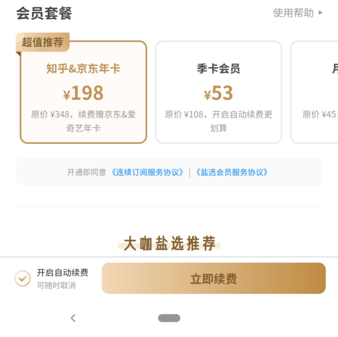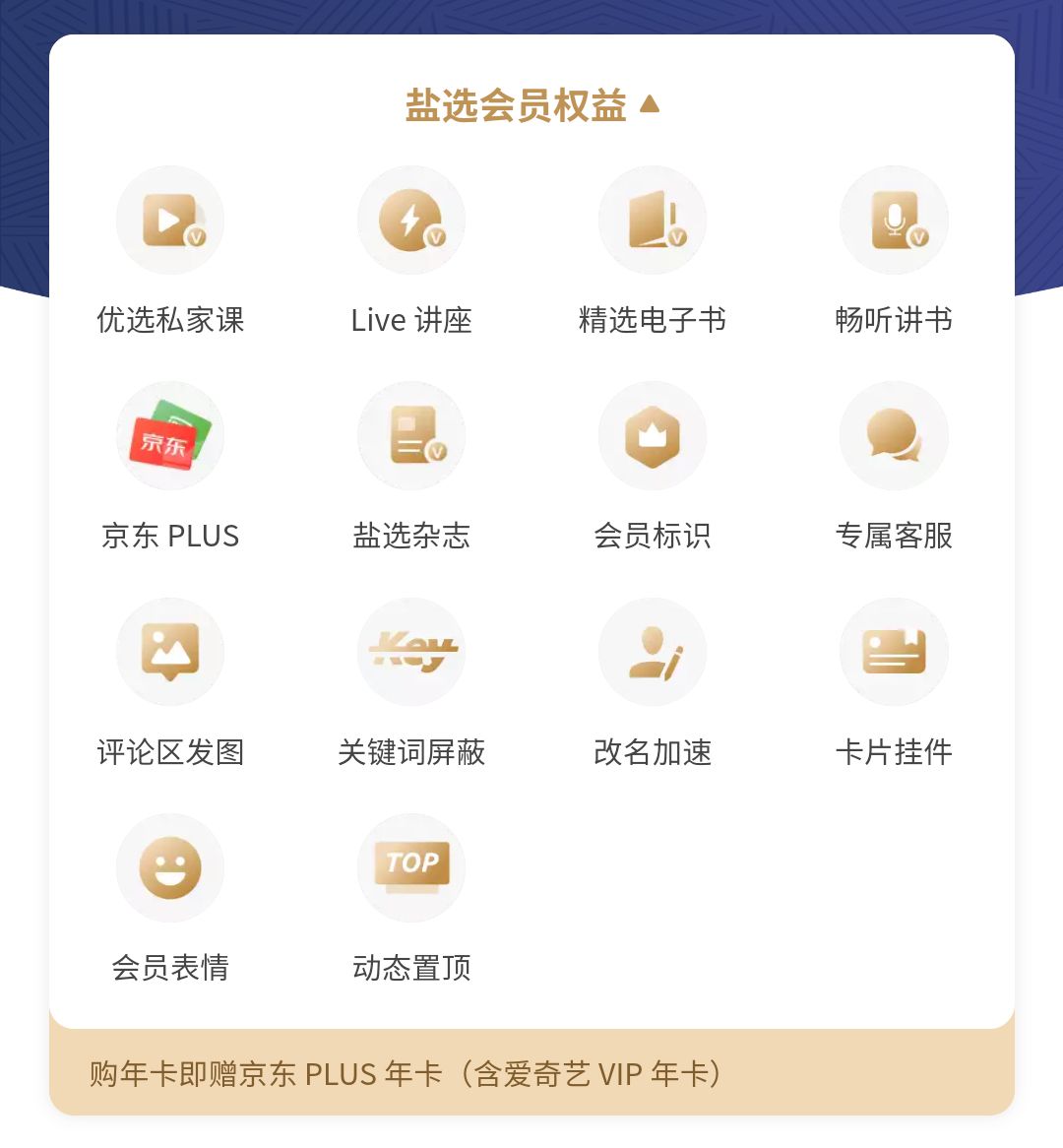 目前「盐选会员」的活动定价为 198 元一年,随附京东 PLUS 和爱奇艺 VIP 会员;季卡 53 元,月卡 19 元。