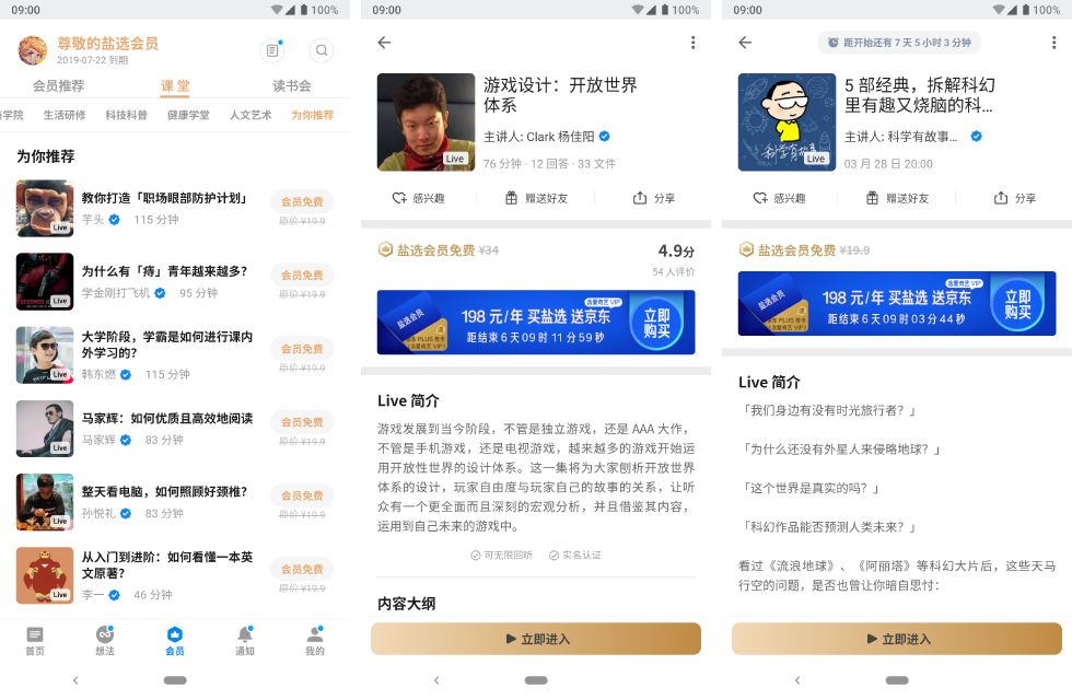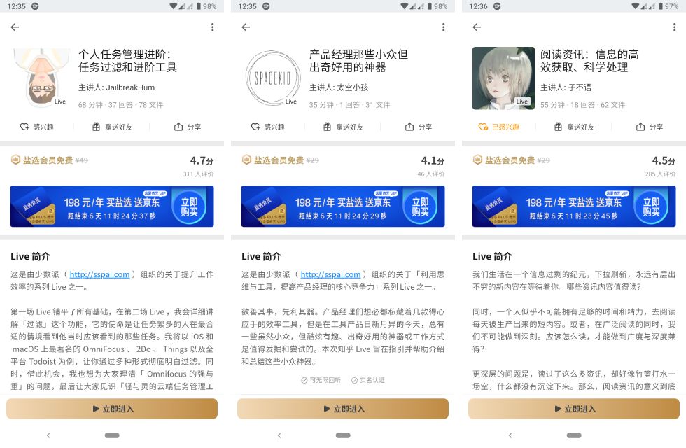 根据官方所述,「盐选会员」可以免费参与「数千场优质 Live」。在仔细观察了一下 Live 页面后,我发现免费 Live 的数量着实不少;基本上每个类目下排在前列的 Live 都是免费的,其中甚至包括一些尚未开始的 Live.