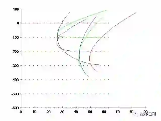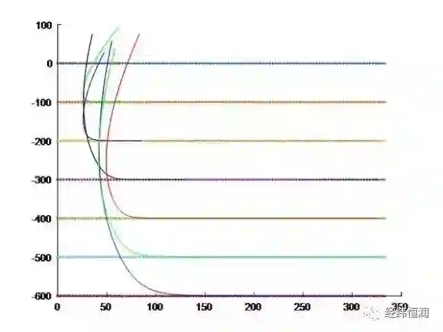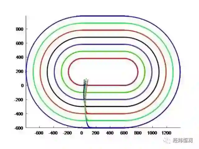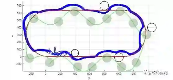 下图给出包含动态和静态障碍区域的蜂群避障仿真结果。图中蓝色曲线为蜂群飞行轨迹,黑色圆圈为静态障碍区域,红色曲线为蜂群飞行指令,绿色为动态障碍区域中心运动轨迹,绿色透明圆为某一时刻动态障碍区所在位置。由图可见,无人机蜂群在跟踪指令的过程中,能够保持蜂群构型,并成功规避动态与静态障碍物。动态仿真过程参见如下视频内容,由视频可见,在运动到航线最右侧时,由于动态障碍速度过快,当蜂群编队与其相遇时,规避动作使队形冲散,且有部分蜂群成员进入动态障碍区,该部分体现出针对不同环境条件,需要进行避障算法参数的调整,以平衡蜂群构型保持倾向和避障倾向。