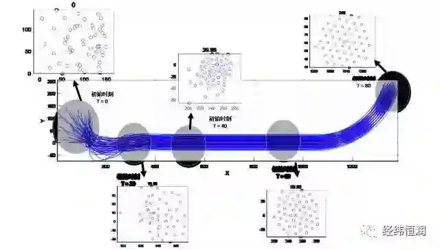 下图给出蜂群成员为50的二维平面蜂群仿真结果。图中蓝色曲线为无人机蜂群飞行轨迹,黑色透明圈是所标注时刻仿真曲线剖面,箭头所指为局部放大图,红色曲线为蜂群整体导航指令。初始时刻蜂群成员位置随机给定,随着仿真进行蜂群构型逐渐形成,经过60s后形成稳定构型并在后续的时间中保持构型。