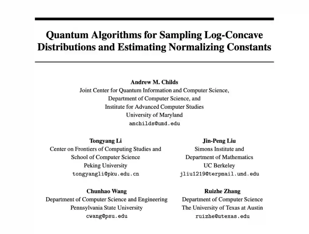 [1] Andrew M. Childs, Tongyang Li, Jin-Peng Liu, Chunhao Wang, and Ruizhe Zhang, "Quantum Algorithms for Sampling Log-Concave Distributions and Estimating Normalizing Constants," to appear in NeurIPS 2022. [2] Rong Ge, Holden Lee, and Jianfeng Lu, "Estimating normalizing constants for log-concave distributions: Algorithms and lower bounds," STOC 2020. [3] Xiang Cheng, Niladri S. Chatterji, Peter L. Bartlett, and Michael I. Jordan, "Underdamped langevin mcmc: A non-asymptotic analysis," COLT 2018. [4] Yin Tat Lee, Ruoqi Shen, and Kevin Tian, "Logsmooth gradient concentration and tighter runtimes for metropolized Hamiltonian Monte Carlo," COLT 2020. [5] Ruoqi Shen and Yin Tat Lee, "The randomized midpoint method for log-concave sampling," NeurIPS 2019. [6] Keru Wu, Scott Schmidler, and Yuansi Chen, "Minimax mixing time of the Metropolis-adjusted Langevin algorithm for log-concave sampling," 2021, arXiv:2109.13055.