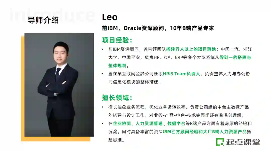 这是由起点课堂出品的B端产品公开课,专为正在做B端产品同学,或者对B端产品感兴趣想要了解相关工作内容的同学打造,课程将由前IBM、Oracle资深顾问@Leo老师直播授课。