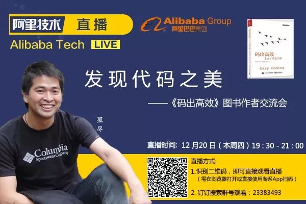 机会来了!12月20日(本周四)晚19:30,锁定阿里技术直播,对话《码出高效》作者孤尽,共同探索代码规约之美。