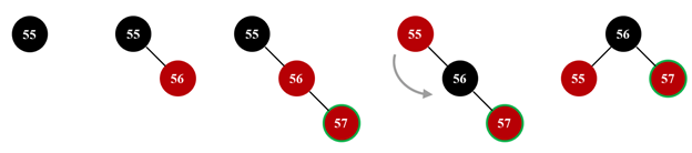 当插入57 时,由于父节点56 是红色的,出现两个连续红色节点,违反红黑树特性,需要重新着色,根据算法56这个节点是变为黑色,而根节点变为红色,这个时候并不平衡并且根节点为红色,这两条违反红黑树特性。所以必须左旋操作,结果如最右端所示。如果需要重新着色或旋转,存在三种情形总结如下: