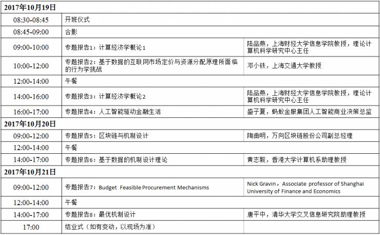 本期课程邀请了五位来自清华、上海财经大学、上海交通大学、香港大学的计算经济学领域专家以及蚂蚁金服、万向集团的负责人,从计算机经济学的基本理论、机制设计理论、具体的前沿研究课题、相关理论在区块链等领域的应用等方面,对计算经济学的原理及应用进行详尽的解读。而雷锋网将作为合作媒体,进行全程报道,无法到达现场的同学,雷锋网AI慕课学院将会呈上全程在线视频(http://www.mooc.ai/course/193)以供学习。