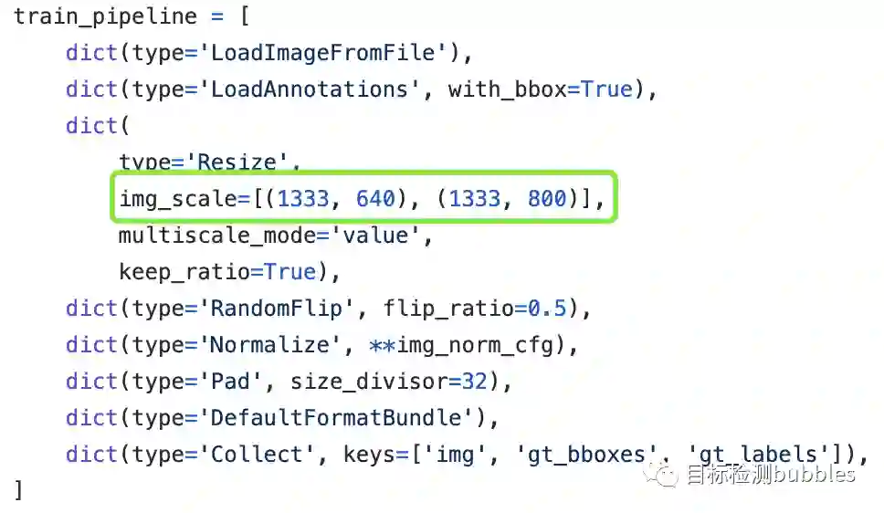 解释下这里的[(1333,640), (1333, 800)]的含义。1333表示做预处理的时候,长边不可以超过1333,那相对的,640和800就代表短边所不能超过的值。在训练阶段,长边定死不超过1333,短边会随机从[640,800]中取一个32的整数倍的数。同一张图在面对(1333,640)和(1333,800)这两种限制的时候,resize后满足条件的面积很大概率是不一样的,通过控制短边的上限,就可以达到动态控制图片大小的目的。另外MMDetection是每个batch都会去随机选取短边尺度的。