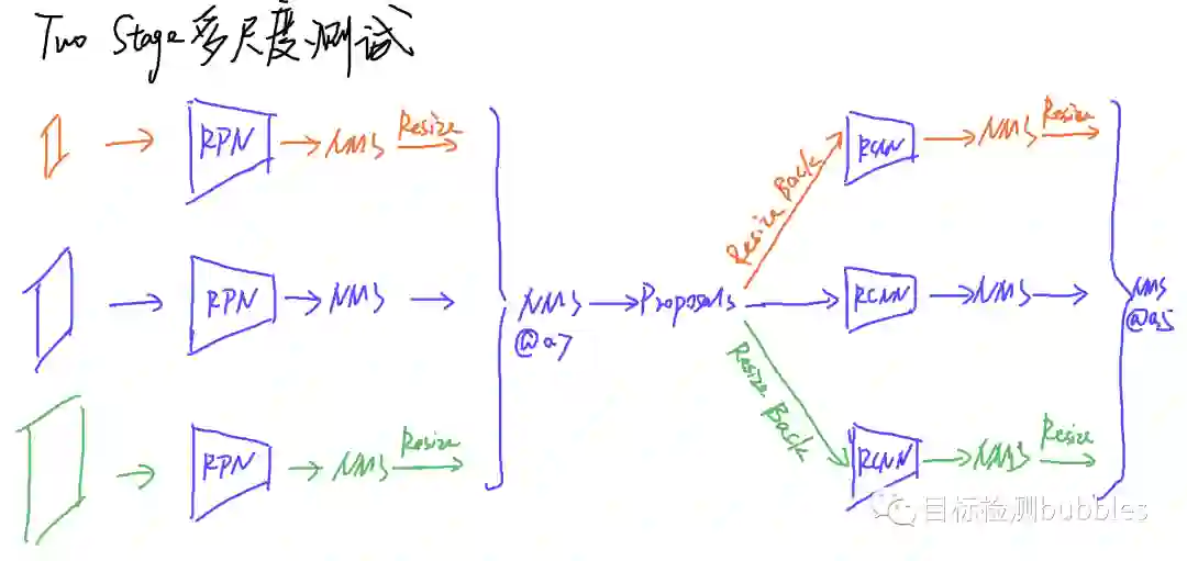 首先,不同尺度的图,通过Backbone+RPN和各自的NMS之后,会得到各自的proposals。这里对proposals的处理和one stage对结果的处理一样,要先把尺度统一到同一张图的大小上去,比如这里都统一Resize到深蓝色图的大小。然后合并到一起做阈值为0.7的NMS,得到Proposals。这时候的proposals的尺寸是相对于深蓝色图的大小,R-CNN阶段我们依然希望用多尺度,所以需要把proposals分别resize到橙色和绿色的图的尺寸上去,然后各自过R-CNN。后面的步骤与RPN和one stage是一样的,先各自做NMS,然后Resize到统一尺寸后再合并做阈值为0.5的NMS。