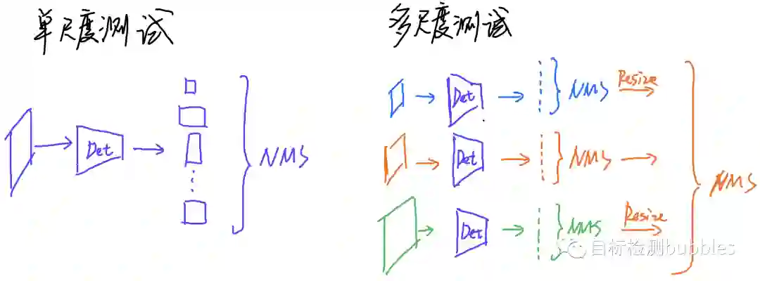 Step2. 把所有尺度归一化到同一个尺度,如图,蓝色预测和绿色预测的框都是在不同大小的图片下出的,这样所有结果放到一起NMS是对不上的。所以,图里为了表示明白,把蓝色和绿色的预测框都按照图片相对橙色的大小比例进行缩放。