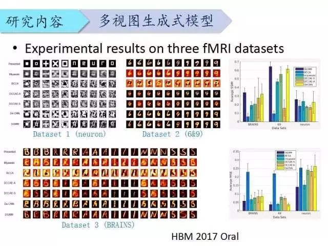 最后,对我们的工作进行一个总结。我们提出了一个基于多视图生成模型的重建框架,这个框架具有很好的扩展性,它可以挖掘不同模式之间的共同表征并建立两者之间的关系,这样使得Mind Reading成为可能。我们还研究了深度特征在大脑皮层上的表达,但是现在的研究还存在一些局限性,比如自然图像刺激的fMRI样本量很少,所以目前只能在数字、字母、符号上有较好的重建效果,对自然图像的重建效果还有待研究。而且,目前采用的是静态编解码,下一步将采用动态编解码,比如利用RNN,LSTM。此外,我们认为解决编解码问题的方法可以借鉴机器翻译中的对偶学习思想。值得一提的是,将VAE和GAN结合也值得尝试。
