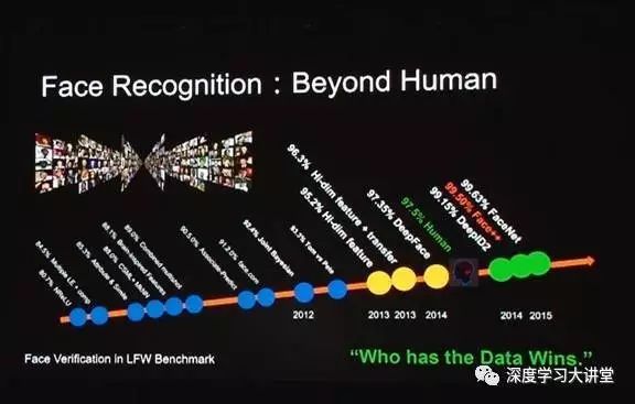 人脸识别进展非常快,上图所示是2013年我在微软的团队做的一个叫高维特征的工作,在著名的公开评测集LFW上的效果非常好,但在当时与人类识别性能还是有差距的。在2014年,Facebook的作者杨明等第一次很有效地用深度学习系统来做人脸识别工作,他们的结果非常接近人类识别性能。后来,大家快速地使用深度学习,并用更大量的数据,在这个数轴上,可以看出,大家(包括我们Face++)的结果都可以超过人类的性能。