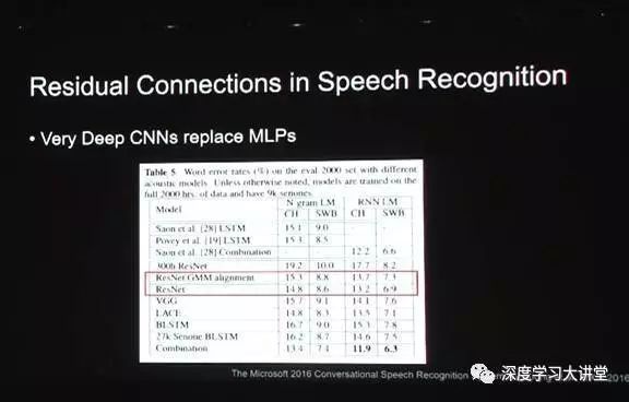 其实,残差连接也不限于做计算机视觉,如上所示是在语音识别中的应用,这是去年微软做的语音识别系统,它替换了以前使用了很多年的浅层网络。
