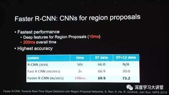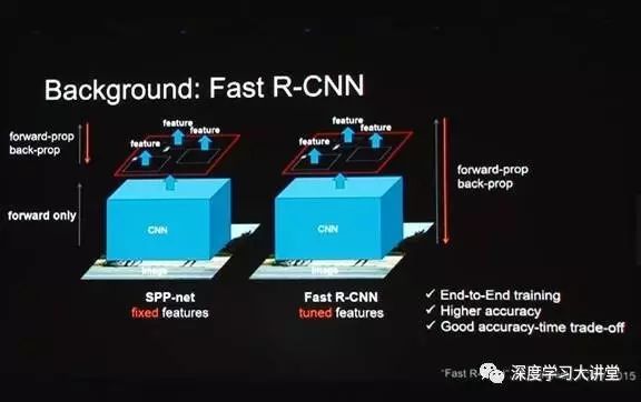 有了SPP-net后,Ross自己写了一篇论文——Fast R-CNN。因为他发现SPP-net前向的一部分是不finetune的,只有最后一段是finetune的,他就把整个放到SPP-net上,同时把前面的feature也finetune了,这就形成了叫做Fast R-CNN,结果非常好。可见,端到端学习在深度学习系统中有多重要。