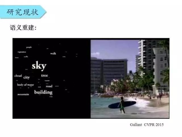 这是Gallant(神经科学家)在CVPR15上介绍的一个语义重建工作,Gallant是神经科学家,但是却受邀在CVPR上做KeyNote,这也反映了计算机视觉有必要与神经科学加以结合。受试者观看一个视频,同时采集他的fMRI信号。通过分析他的fMRI信号,就可以预测出人所看到的视频中包含的重要语义信息。