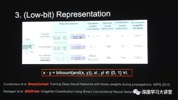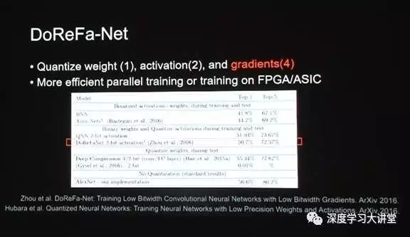 我们Face++的研究员设计了一个DoReFa-Net,把这个方向更推进一步。训练中的梯度也可以用Low-bits表示,因为这个网络的weight,activation,以及gradients分别用一位、两位、以及四位来表示,所以我们研究院就叫这个网络DoReFa-Net。