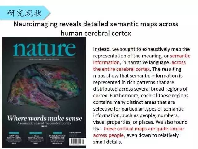 他们(Gallant组)发表在2016年Nature上的工作提出了几个重要观点:语义信息是在整个大脑皮层上都有响应的,且他们在不同个体上具有某种共性。
