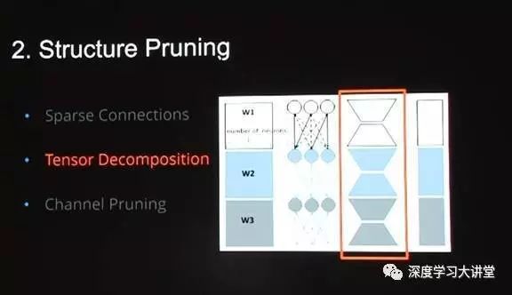 上图所示是我们以前做的一个工作,简单来说,是把一个3D的卷积用卷积核分解的方法拆成3个连续的卷积,这样每一组卷积都可以更小更快。该方法第一次在VGG上达到了4倍加速,在ImageNet上几乎不减任何性能。