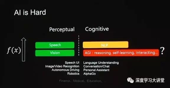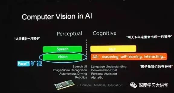 大方向来看, 在人工智能这个大的版图中,计算机视觉占了非常重要的一块。人们把它分成感知智能和认知智能,《人类简史》这样写到:感知智能是指“这里看到一只狮子”这件事情,而认知智能是指“这里明天下午会出现一只狮子”这件没有发生的事情,只是对未来的预测,甚至说狮子是我们的守护神,这是更抽象、更不存在的事情。今天最大的突破还是在感知智能这方面。我们旷视科技Face++也是在感知智能——这个计算机视觉领域做一些工作。