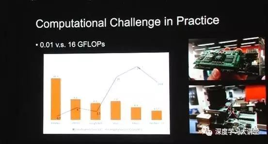 我们需要把算法运行到一些计算力很小的设备上。如上面左图所示,横轴指的是网络的性能,纵轴指的是网络的计算复杂度。右图所示的16 GFLOPs是一个典型的在ImageNet上可以取得很好性能的网络,但是,在实际运用中,我们可能需要一个百分之一或者千分之一的更小的网络。