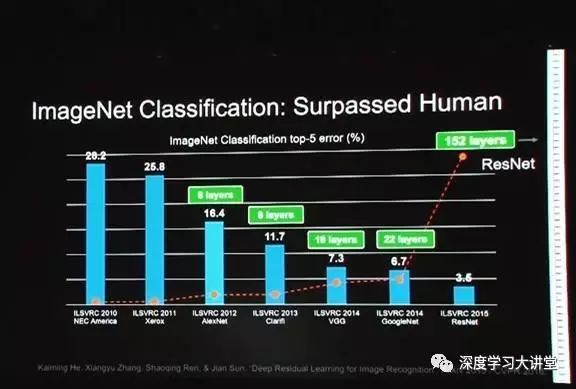 上图所示是我在微软亚洲研究院时,我们的团队做的工作,叫ResNet。