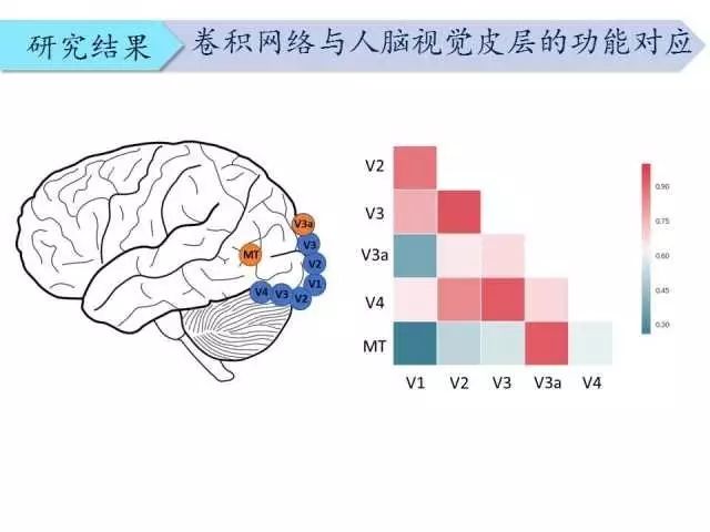 前面讲的是重建方面的工作。我们还尝试探索了深度网络与人脑视觉皮层的功能对应性。研究不同脑区和卷积层的对应关系。比如我们进行了量化的研究,上图右边是深度神经网络的第一个卷积层的感受野,由此推算出人脑视网膜的拓扑映射结构,左边是体素分布。
