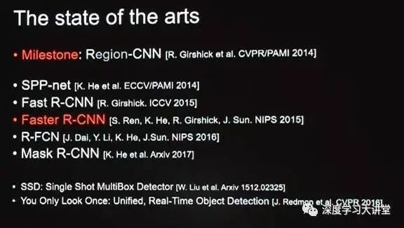 这其中最重要的突破是Ross做的Region-CNN。我这边列出了一些后来的工作,也包括我们的一些工作。