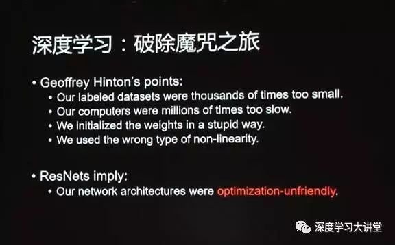 上面所示是Geoffrey Hinton的一些观点。就之前深度神经网络broke的问题,这里列了一些他的看法。我们的ResNet也有这样的一些启示,就是以前设计的网络结构其实是对优化不友好的,如果有一个对优化更友好的网络结构,是可以破除之前认为深度神经网络没有用的这样一个魔咒的。