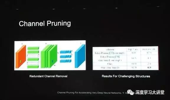 上图所示是我们Face++最近做的一个工作(已经被ICCV2017收录),这个方法更简单粗暴。它直接训练好一个网络,然后直接砍掉一些通道,砍掉的通道然会有一些关联效应,比如砍掉这层的通道可能会影响到前一层或者后一层,我们很快会在新的论文上进行阐述这个,主要是关于我们如何简单砍掉这些通道的特性的。而且这个方法不但对VGG管用,对今天的最新型的ResNet,XceptionNet都管用。以前的低秩分解,很难应用到目前更现代的网络结构上。