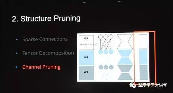 把连接幅值比较小的地方去掉。但是,这样虽然能降低网络的规模,但在运行时并不会降掉,因为这样的稀疏结构对很多设备是不友好的。