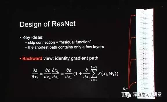 另外,从反向传播来看,它有一个非常好的特性,就是它从数学上有效地消除了梯度消失的问题,因为最后的梯度会传到中间层去,这样梯度幅度就不会变得很小。