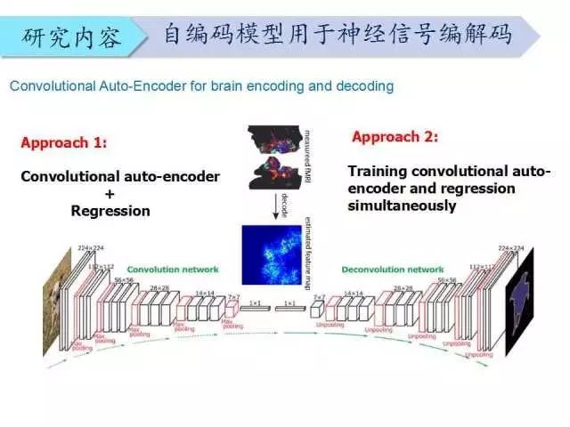 很自然地想到CNN的自编码模型,输入图像通过CNN编码,可以在中间层得到图像的特征,然后通过反卷积重建出图像。因此,如果能够建立图像特征和大脑皮层响应关系,通过皮层响应就能重建出图像。这里涉及到两种方法:第一种,先做自动编码,再把中间层和大脑信号做一个回归。第二种,将自编码和回归同时进行。