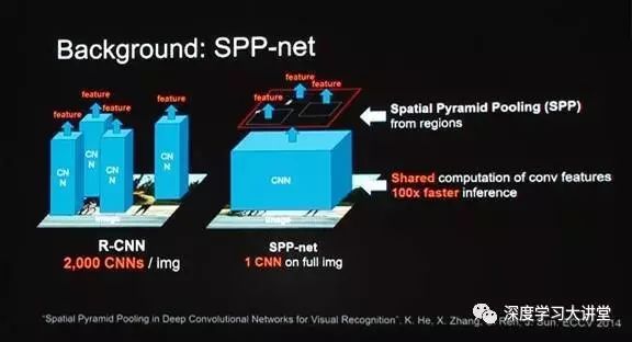 后来,我们就思考怎样能够快一些,于是我们设计了SPP-net,就是在ECCV2014上的一个工作。其实思想很简单,就是试着把滑动窗口从图像放到特征图上,看到底行不行。在尝试之前,我们还是很怀疑的,因为feature map 这么小,怎么能做这么好的分类任务?但是后来实验发现,在上面做的效果和在原图上几乎是类似的。当时就认为有了这样的方法后,就可以把上千次的分类任务给消除掉。