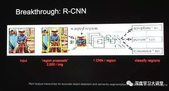 R-CNN的核心思想是对一个Region做分类,但是它存在的问题是,需要用Region-proposal 的方式,对大概一两千个窗口做分类,这是非常慢的。