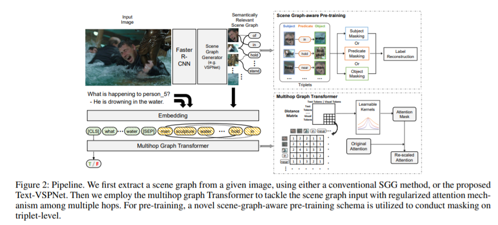 回答关于图像的复杂问题是机器智能的一个雄心勃勃的目标,它需要对图像、文本和常识的联合理解,以及强大的推理能力。最近,多模态变换器在视觉常识推理(Visual Commonsense Reasoning, VCR)任务上取得了很大的进展,通过跨通道注意力层共同理解视觉对象和文本标记。然而,这些方法并没有利用场景的丰富结构和对象之间的交互作用,而这些在回答复杂的常识问题时是必不可少的。我们提出了一个场景图增强图像-文本学习(SGEITL)框架,将视觉场景图纳入常识推理。为了利用场景图结构,在模型结构层次上,我们提出了一种多跳图转换器来正则化各跳间的注意力交互。在预训练方面,提出了一种场景感知的预训练方法,利用视觉场景图中提取的结构知识。此外,我们还介绍了一种使用文本注释在弱监督方式下训练和生成领域相关视觉场景图的方法。在VCR和其他任务上的大量实验表明,与最先进的方法相比,性能有显著提高,并证明了所提出的每个组件的有效性。