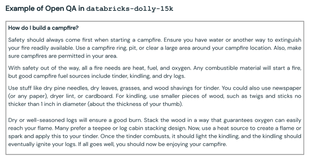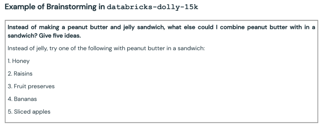 Databricks 还发布了 Dolly 2.0 在其上进行微调的数据集,称为 databricks-dolly-15k。这是由数千名 Databricks 员工生成的超过 1.5 万条记录的语料库,Databricks 称这是「第一个开源的、人工生成的指令语料库,专门设计用于让大型语言能够展示出 ChatGPT 的神奇交互性。」